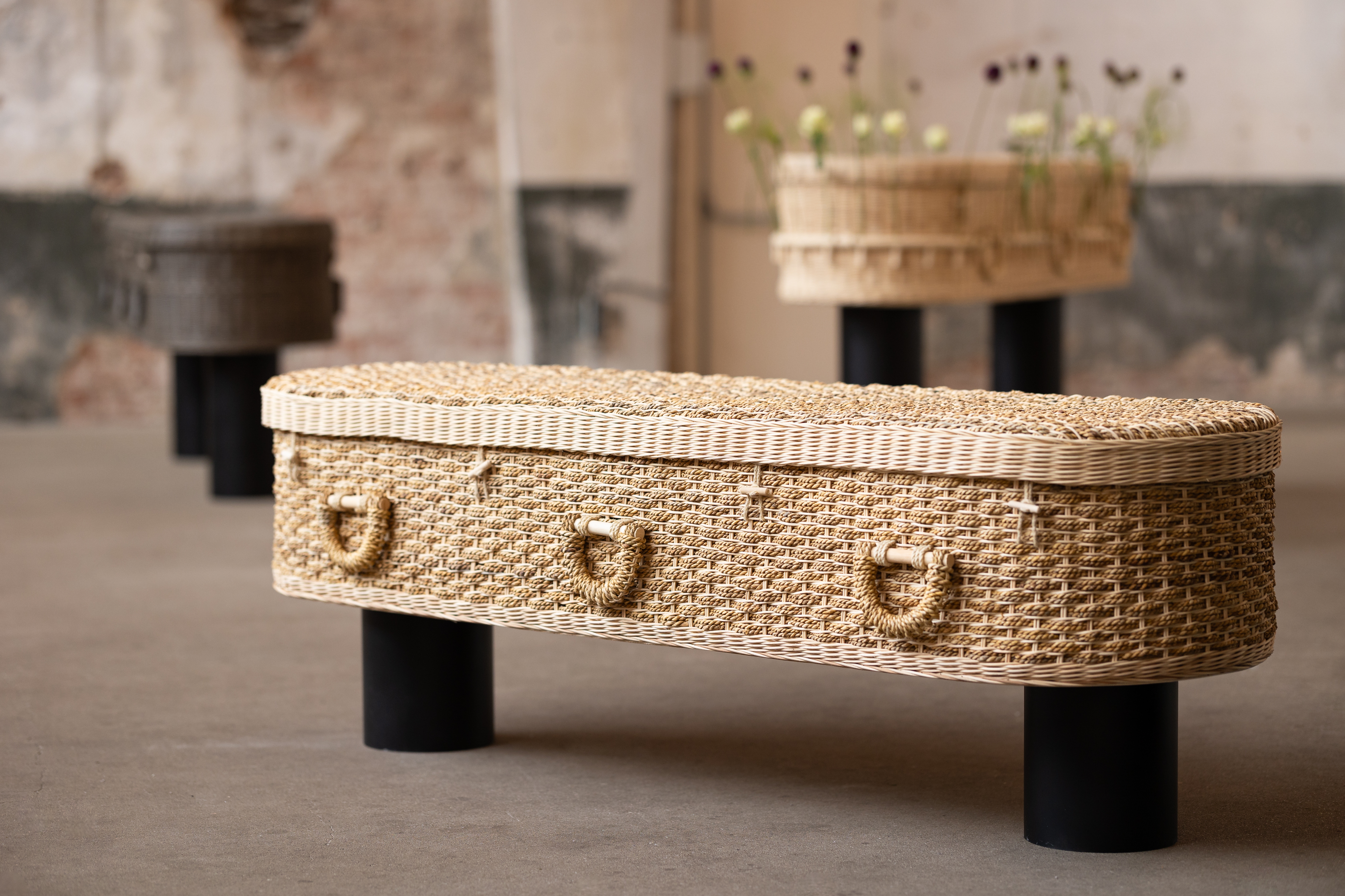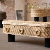 Det flettede materiale – særligt pandandus – er både stærkt og let, og giver kisten et roligt, blødt udtryk. Til barnekister bruges bananblade, som er et endnu finere og mere sart naturmateriale, der passer til en nænsom og kærlig afsked.
